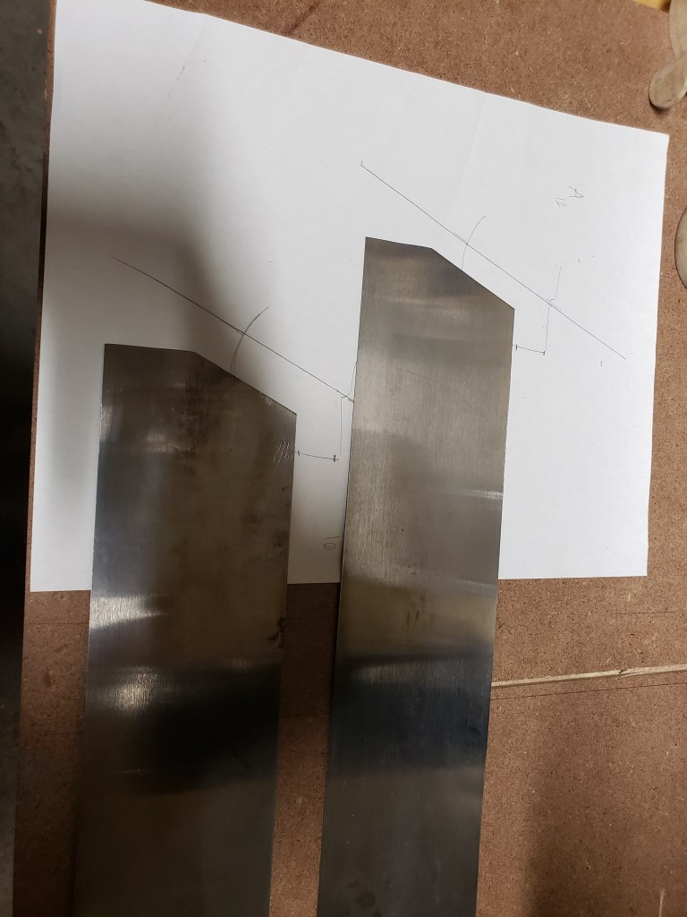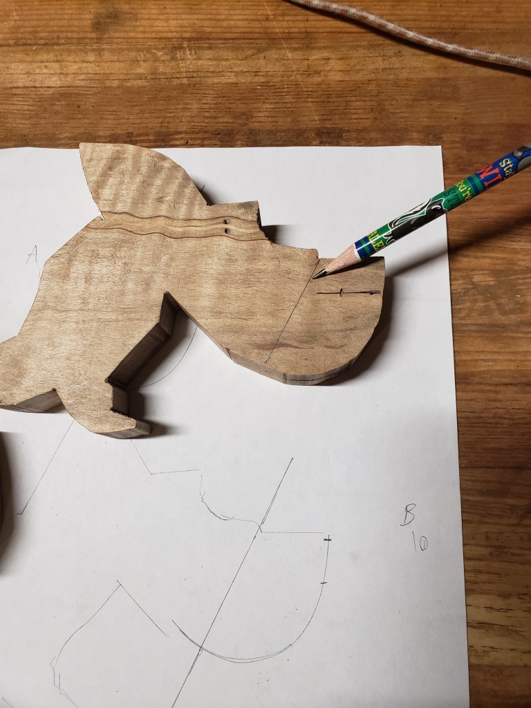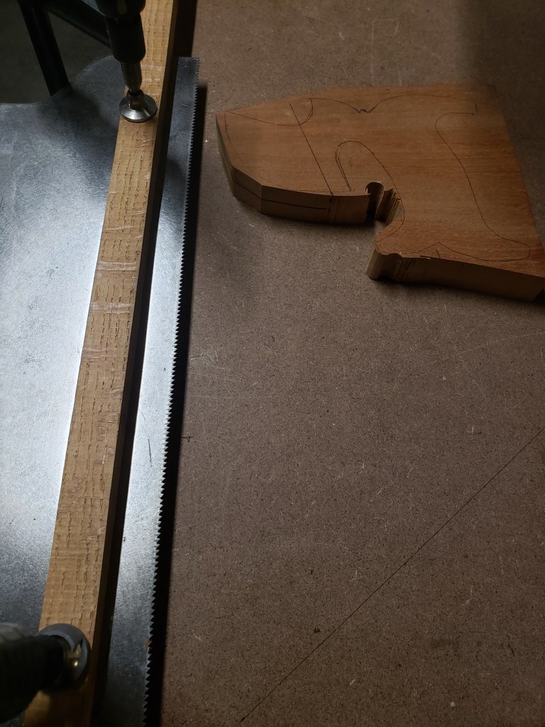 Trace out your handle, mark the mortise and slot angle for the plate. Do not bother to fully cut it out yet, get the nose of handle cut and mark the angle of the plate slot.