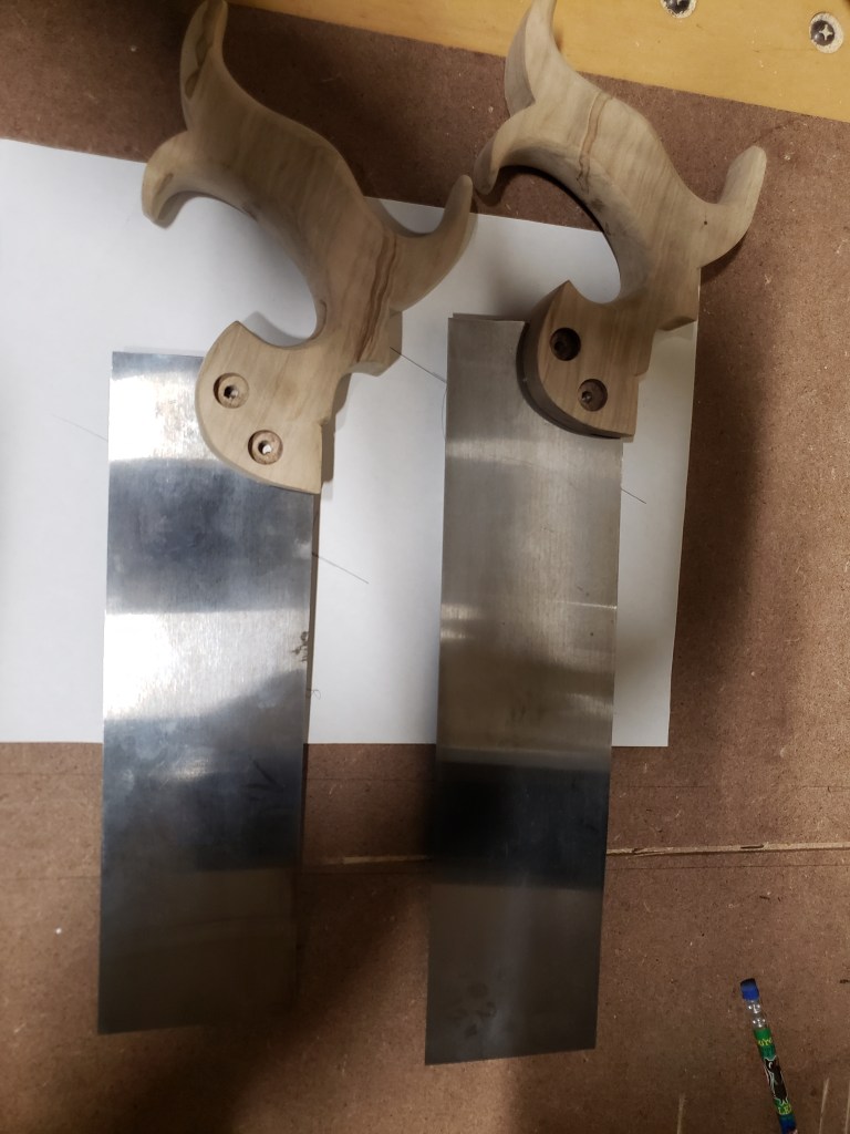 Find a flat surface, and lay your handle blank down on one side. Use a saw with a kerf of the same thickness as your new plate, or go ahead and set and sharpen your new plate, and lay it down next to your handle. Using blocks of wood and sheets or paper, raise the blade off the table until it is raised up off the table and lined up with your slot line. Leave a 1/4 – 1/2 and inch of overhang off the blocks. Clamp this raised plate down to the table. Slide the handle blank along the teeth while still flat on the table. Adjust the plate farther out from the blocks as you need to.