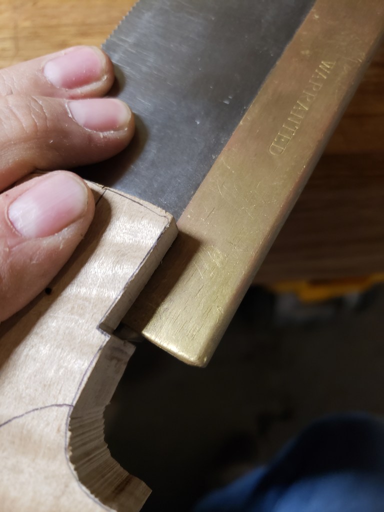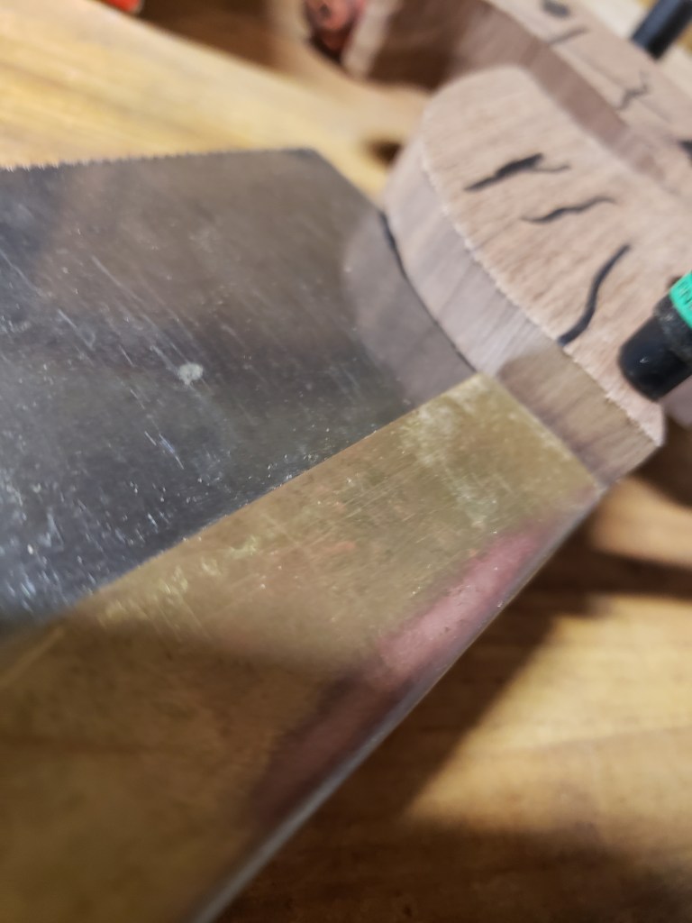 If the slot is nice and straight, let’s double check the angle of the cut and remark on the outside of handle if needed and/or mark it out on a piece of paper. Line up the end of the plate with your line and trim off the excess, have the plate up about where it will be with the back on. (I know these pictures show mortises cut already, ignore that, I will revisit the mortise)