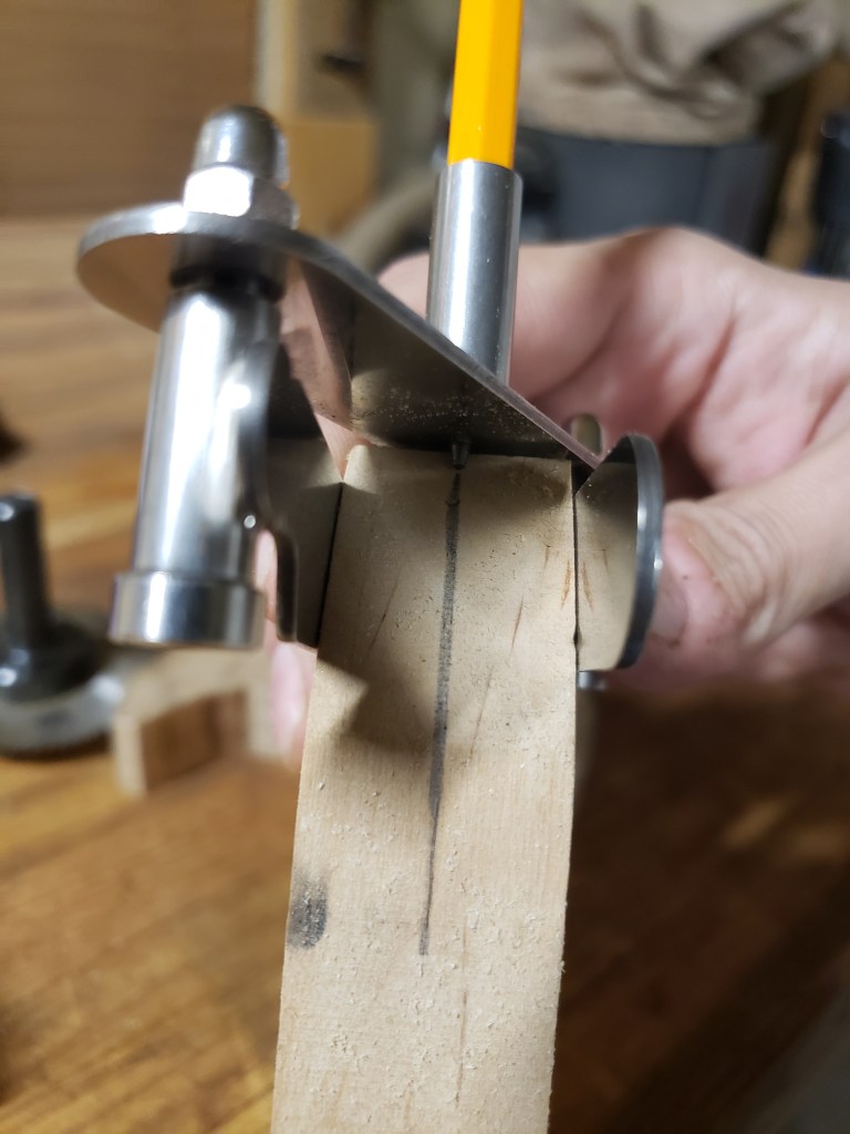 You are leaving the handle real blocky at this time because if you mess up the slot or mortise, at least you didn’t waste time on all that shaping. I use a center finding marking tool on the handle to mark my slot line.