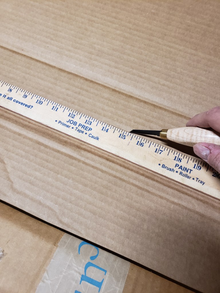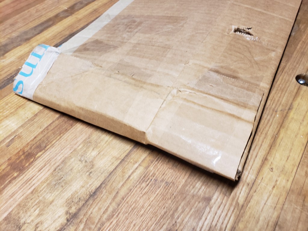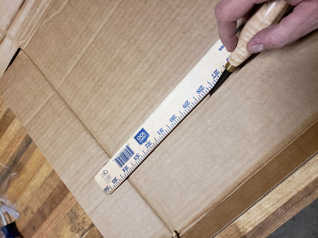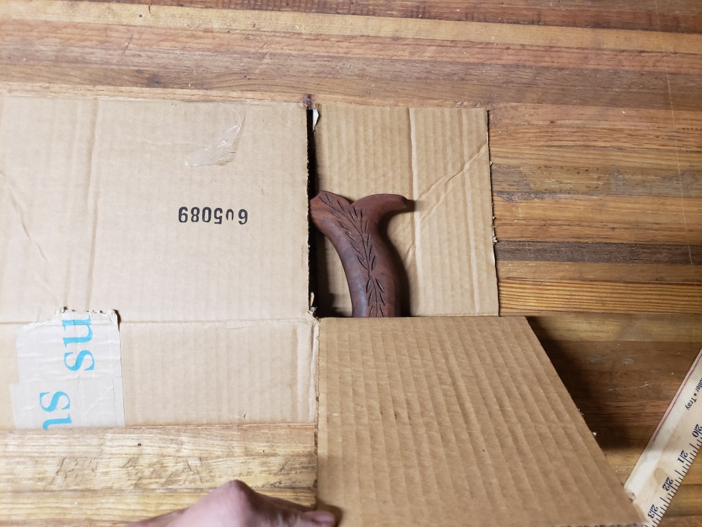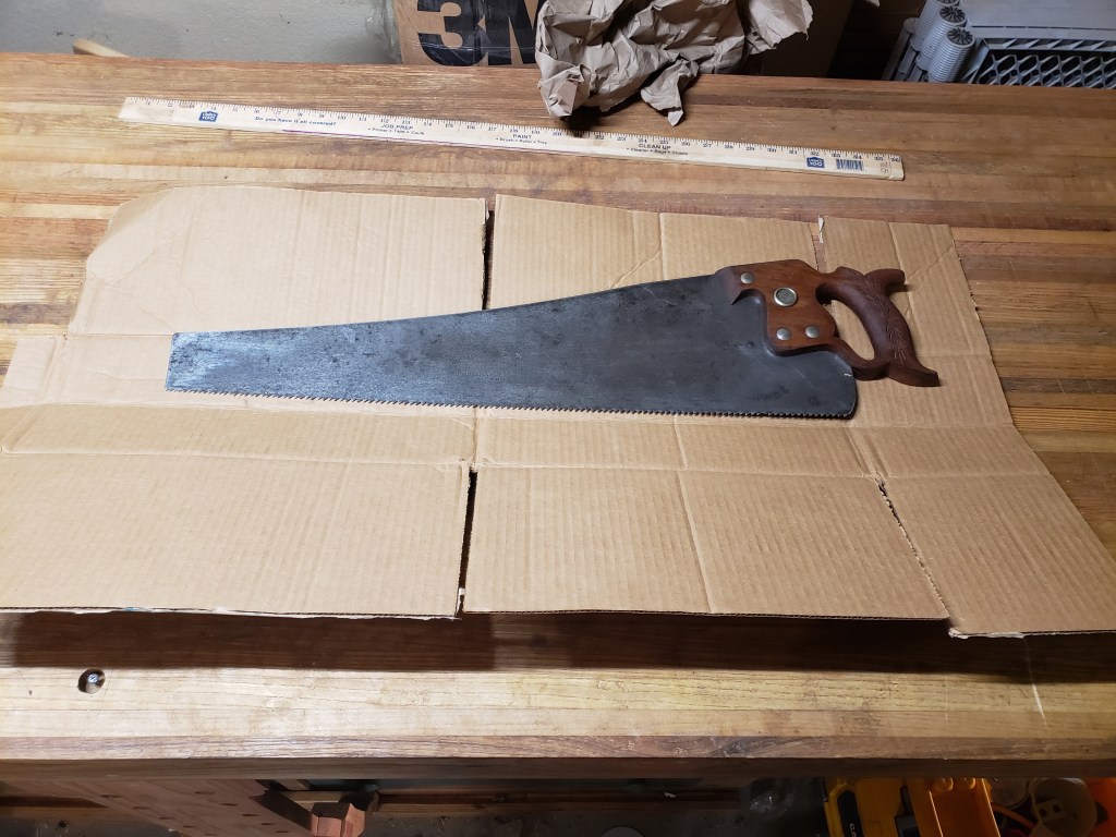 I’ve had some people send me saws just like this. But I prefer to put this inside a nice square cornered box just big enough to keep the sheath from moving around. I have personally found a yard stick to be almost the right width for marking my folds. I score the cardboard to make it easier to fold and build the box around my wrapped saw. I try to find cardboard that is big enough for this part.