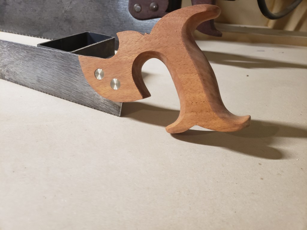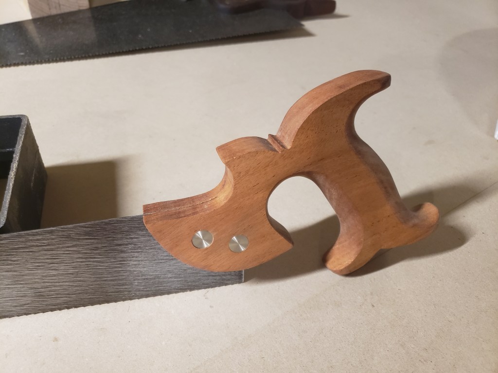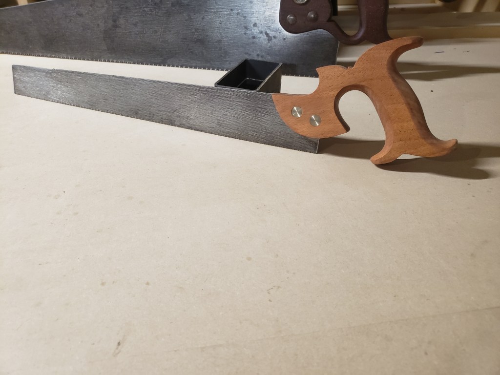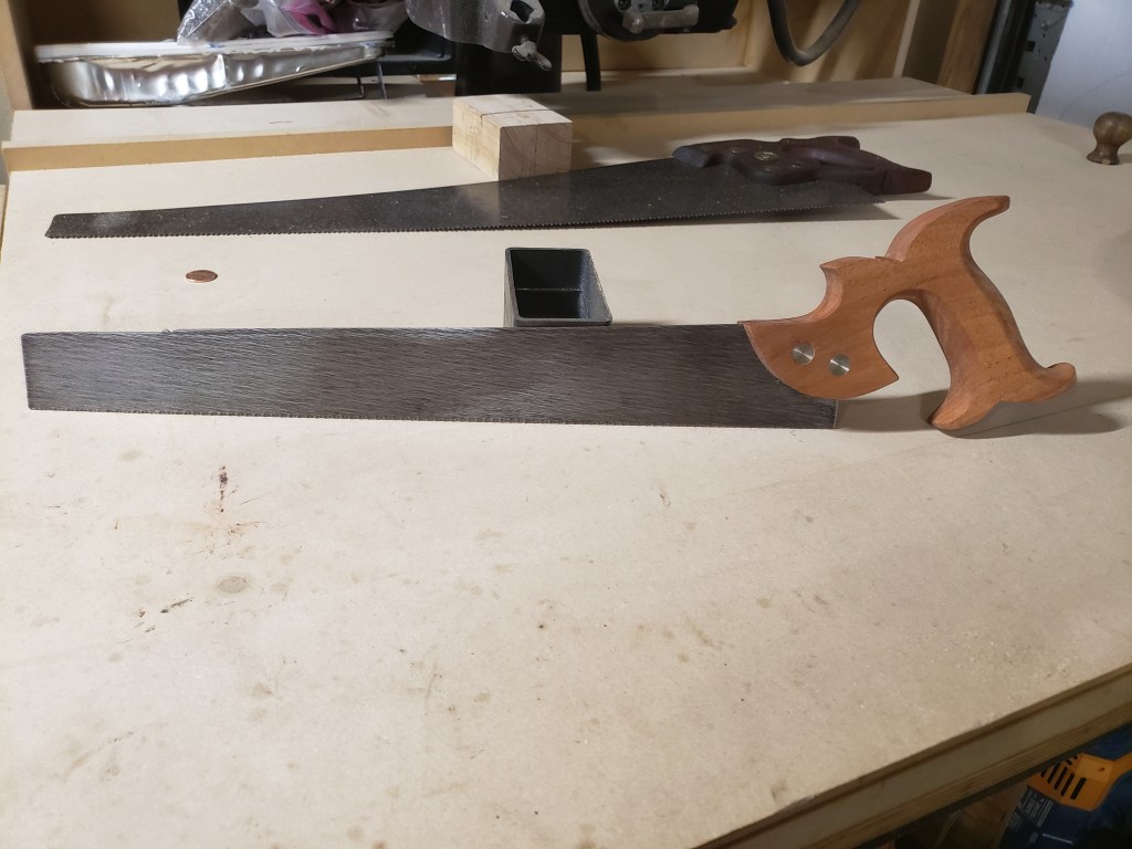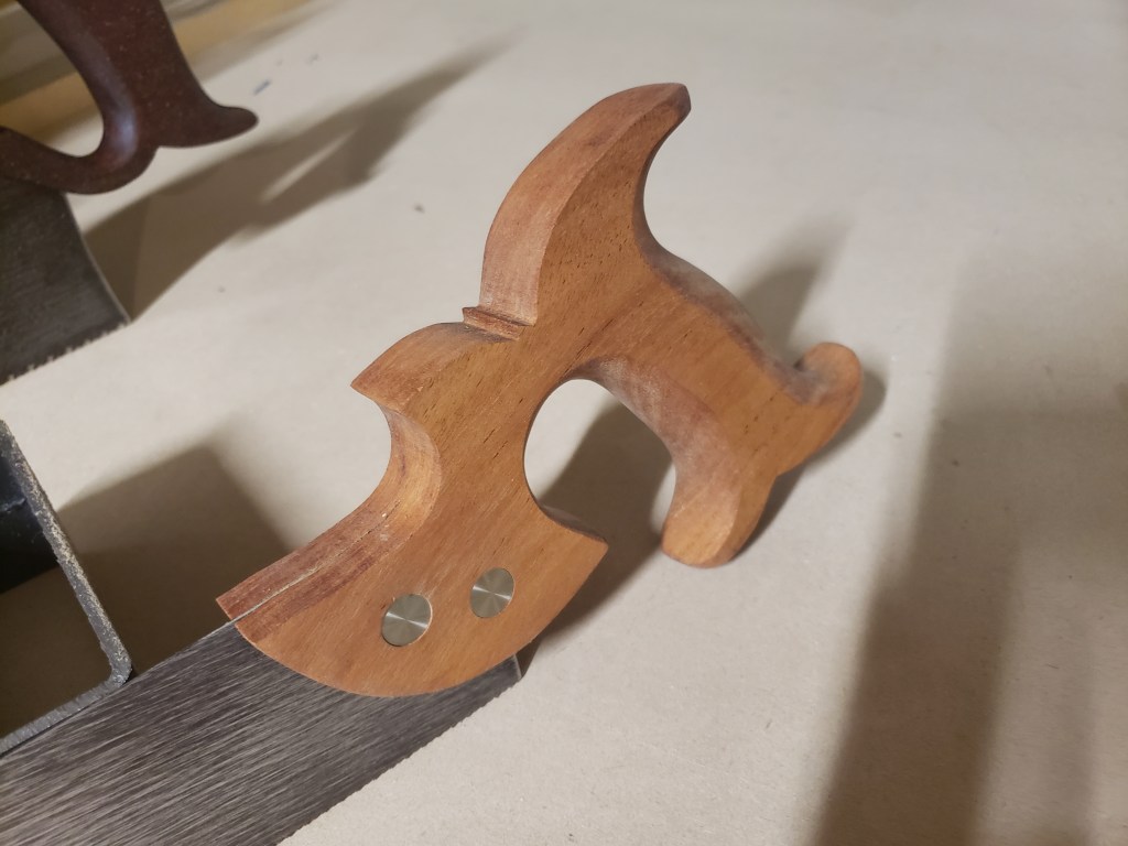 My saw is based on the Disston version. Last seen in their catalog in 1918. I was fortunate enough to get my hands on an original for a brief time. 16 inch toothline. And a handle very similar to a dovetail saw.
